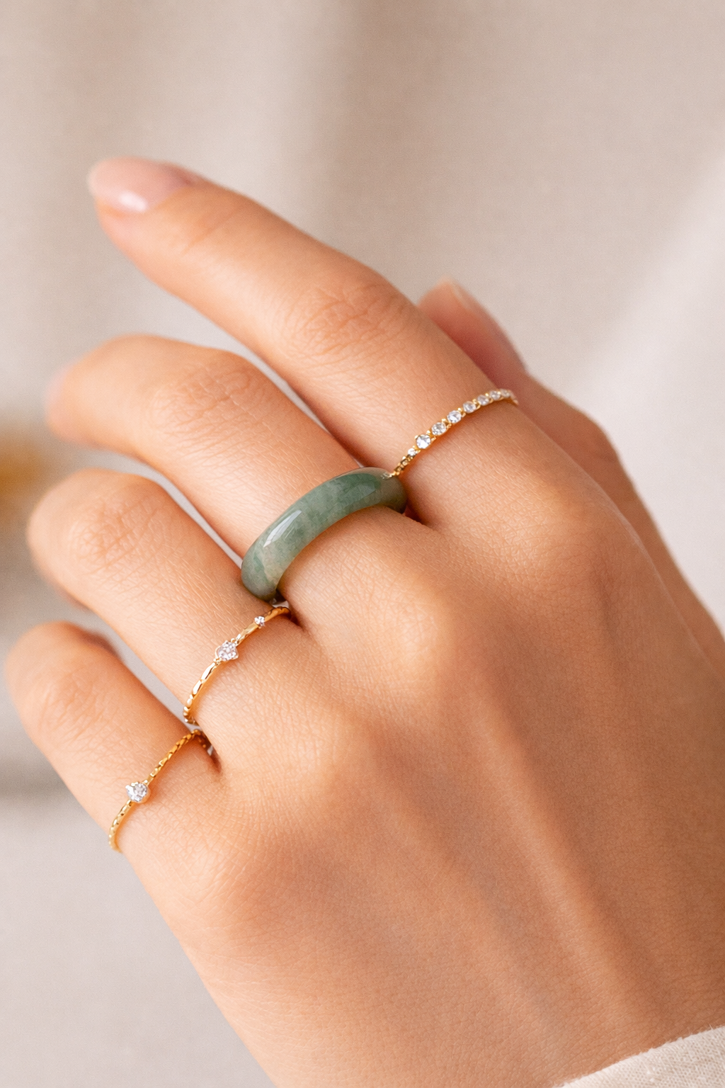 The Earthlight Jade Ring carries a soft, natural green tone with gentle variations that flow through the stone, each shade forming organically, never repeated. Its smooth polish brings out a subtle sheen, allowing the light to move across the surface while still holding that grounded, earthy depth.