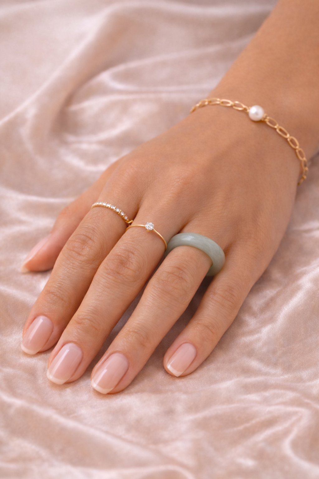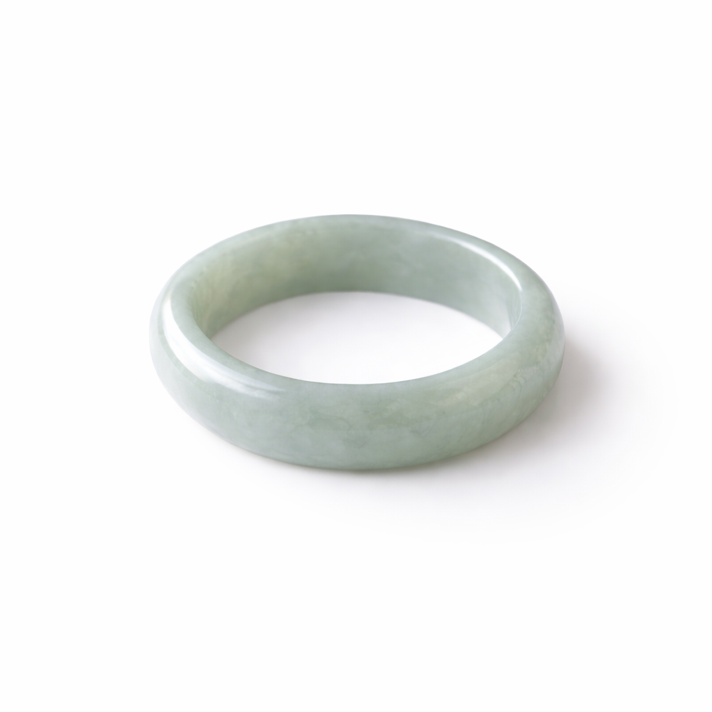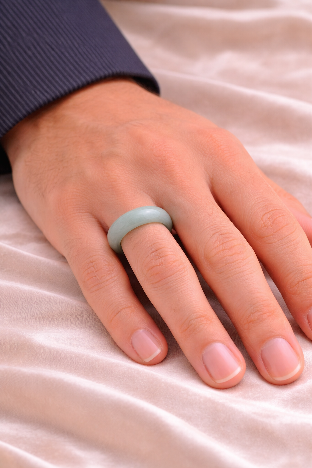 Soft, pale tones blend gently across the surface, with fine jade grain and light translucency giving the ring a calm, airy feel. Subtle variations in color and natural inclusions make each piece unique while keeping a smooth, even appearance.