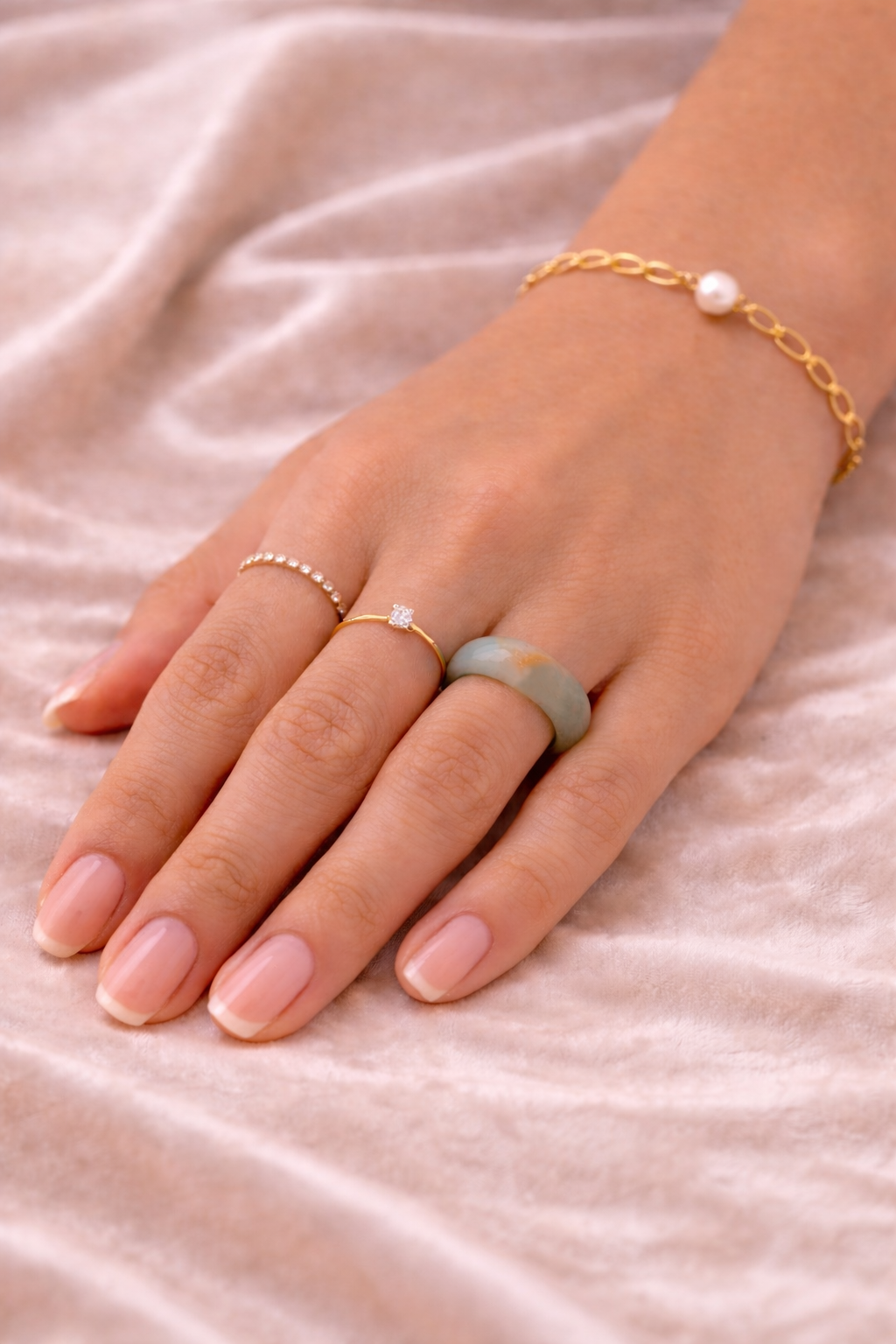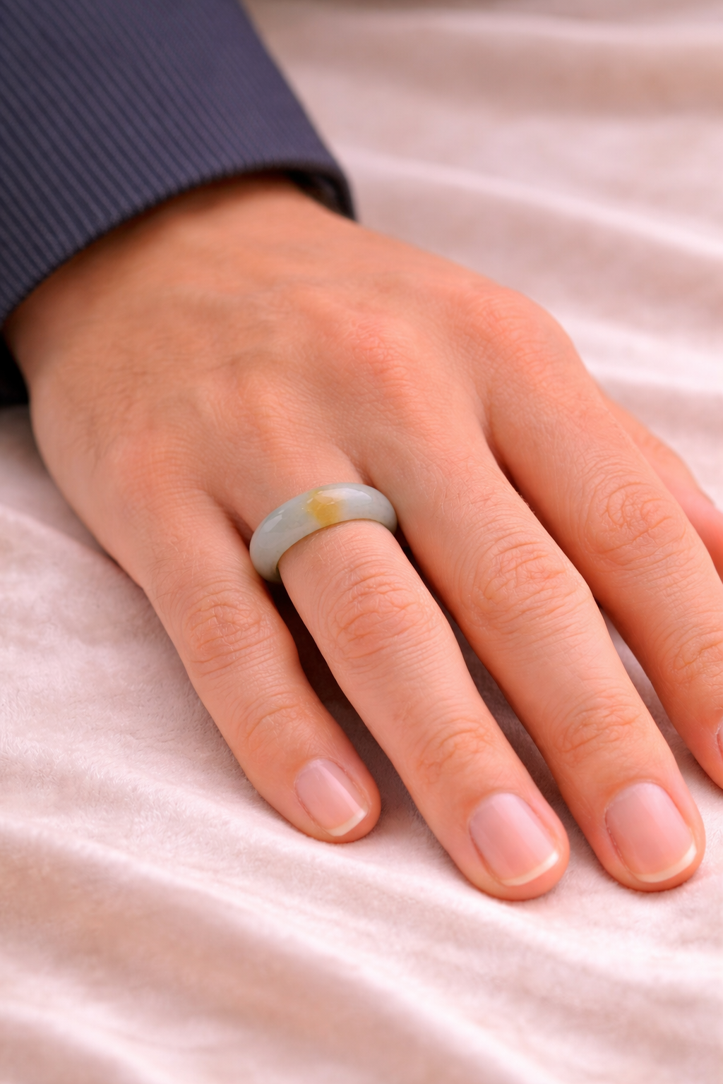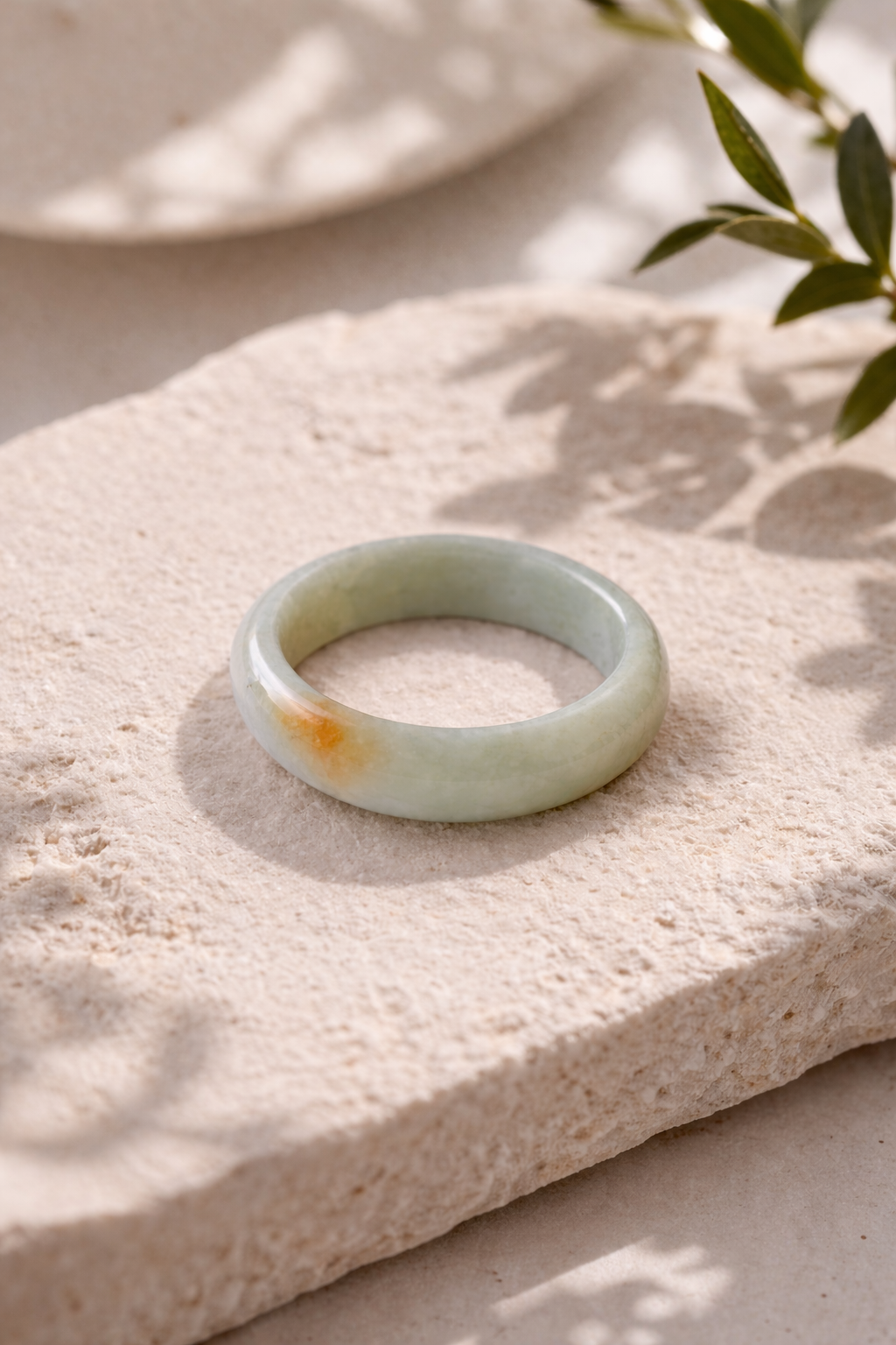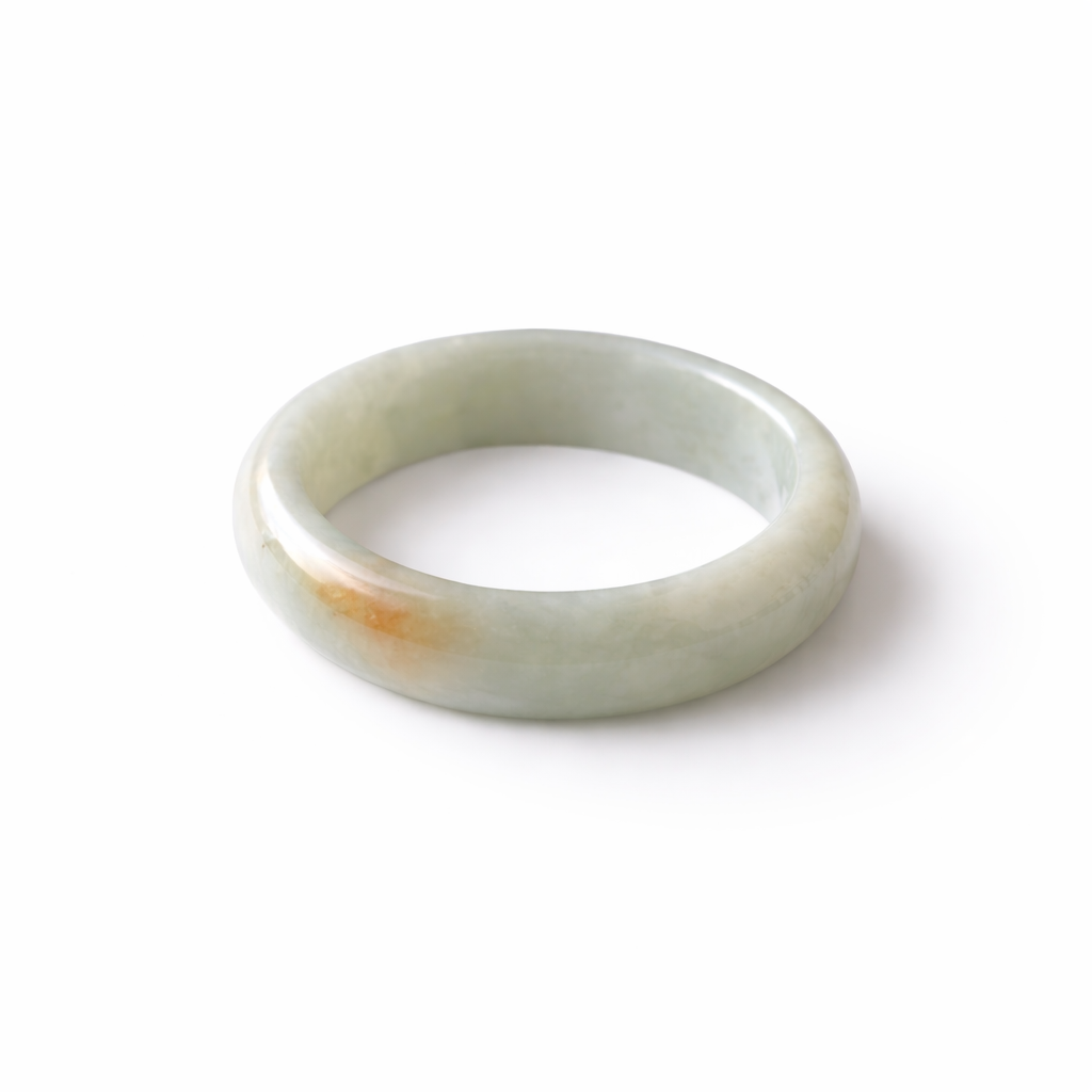 A soft mist like jade tone carries a warm golden inclusion, naturally formed within the stone, resembling the quiet glow of early morning light. With fine jade grain and natural translucency, each ring holds its own depth and variation, shaped over time.