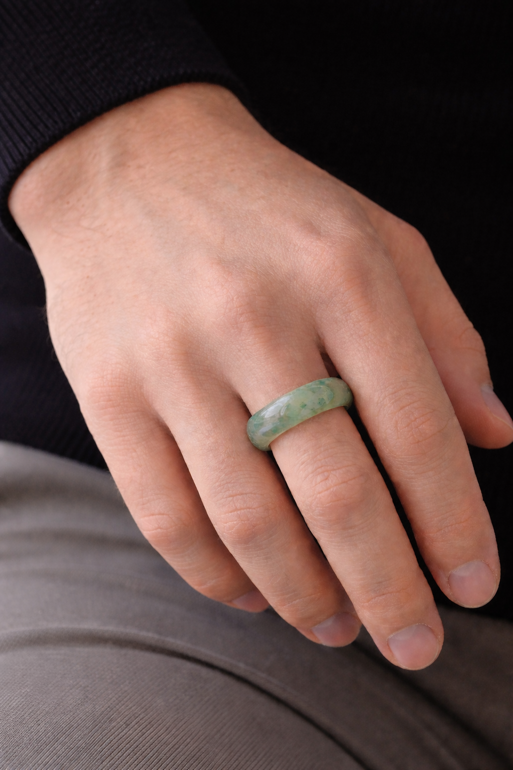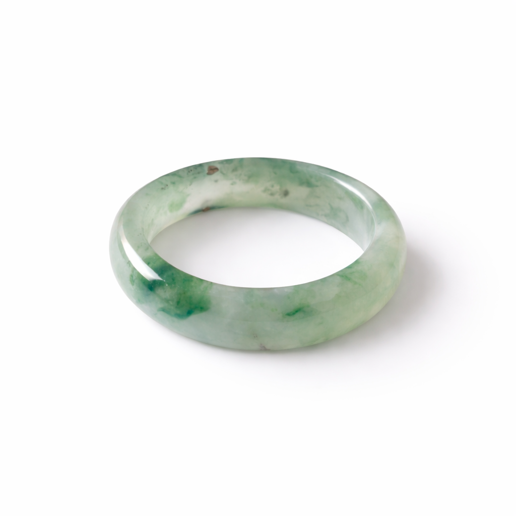 A soft white jade base carries concentrated green tones that form naturally within the stone, creating depth and contrast unique to each piece.