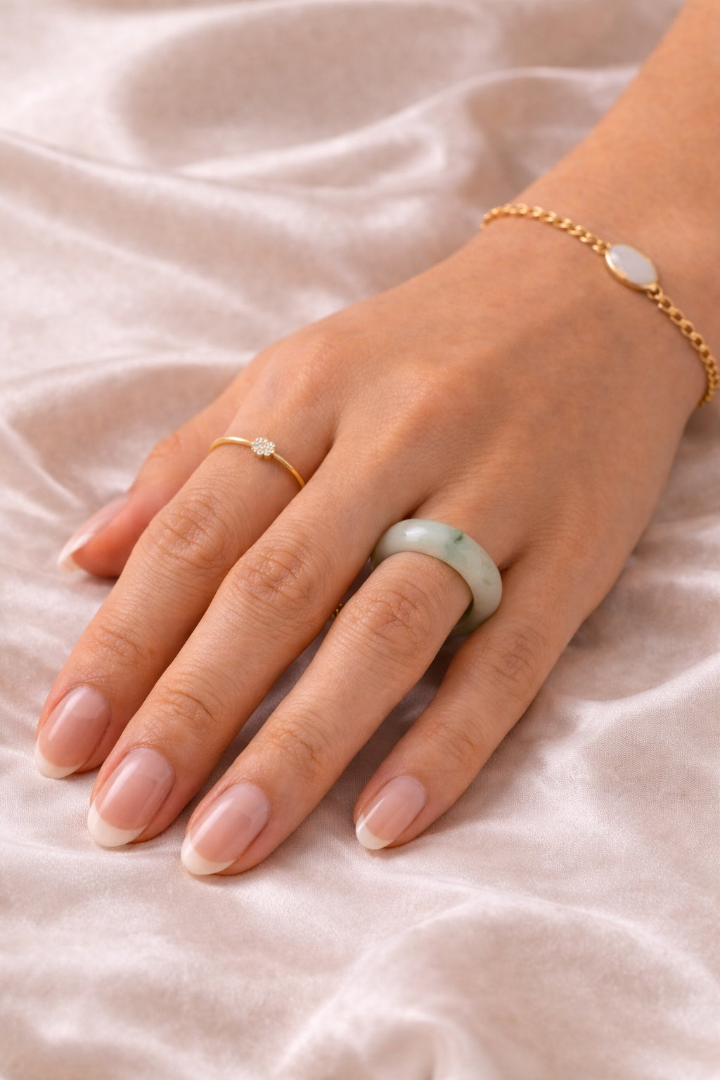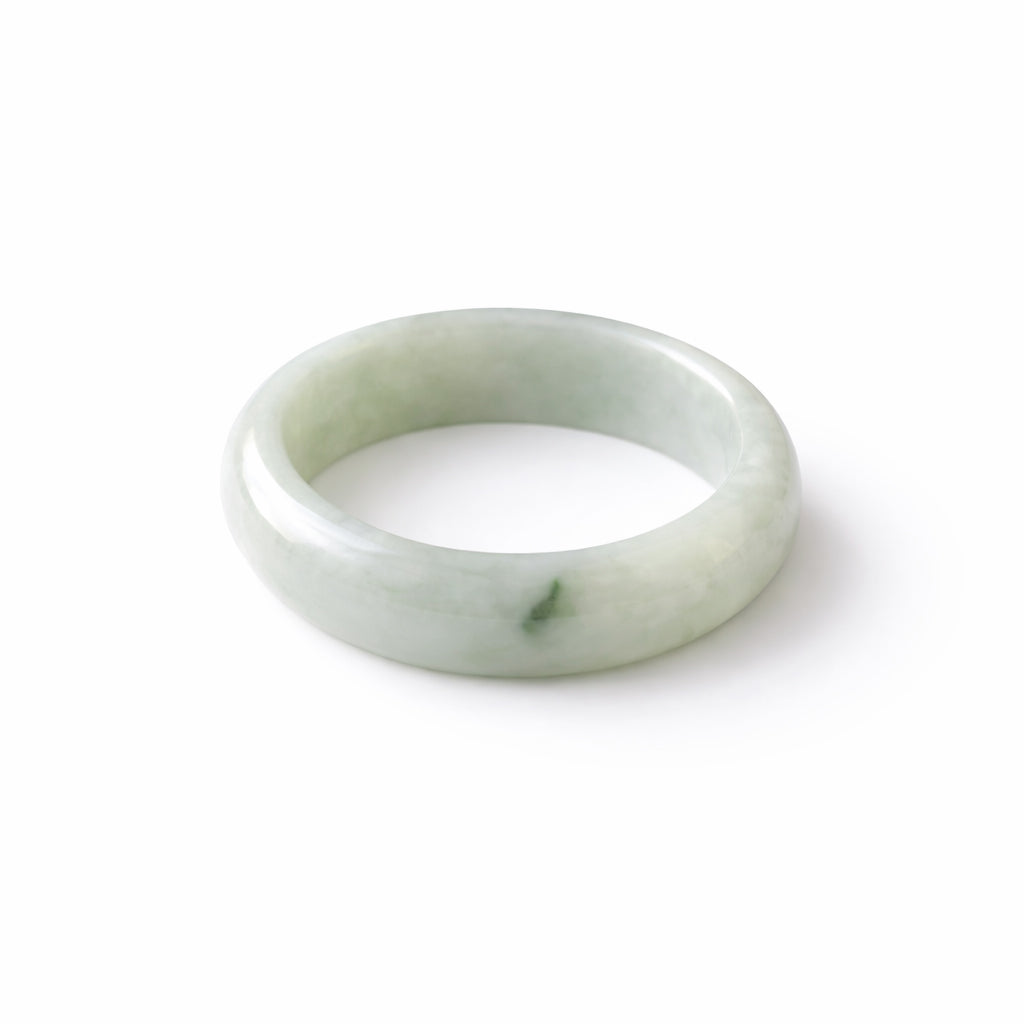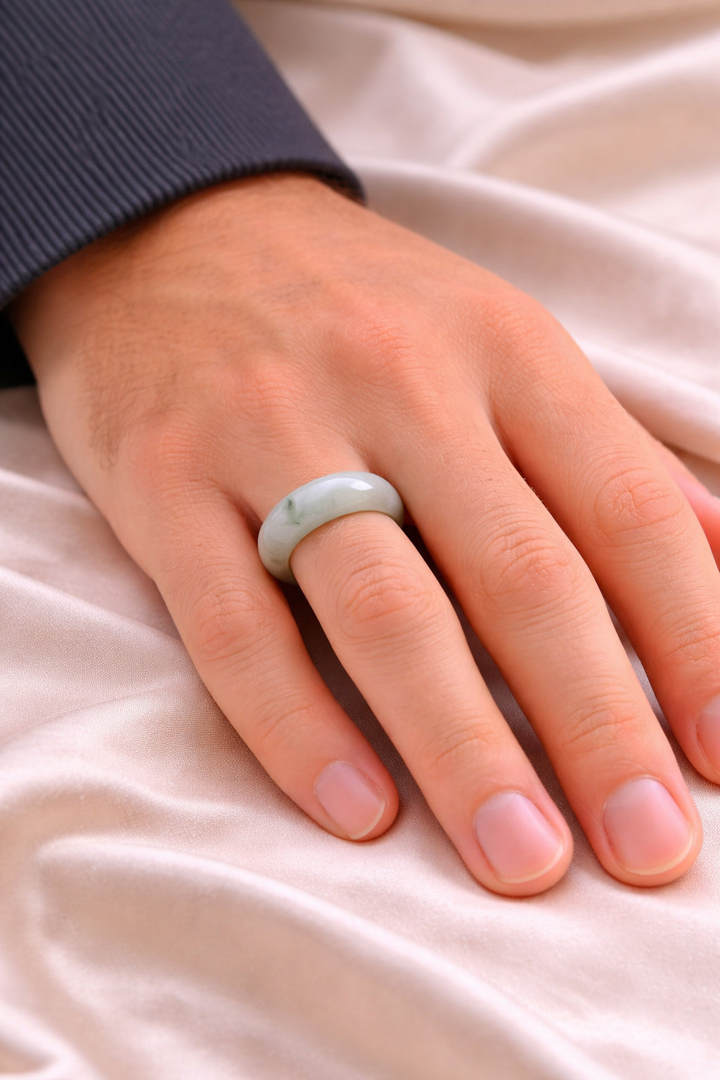 Fine jade grain and natural translucency give the ring a smooth, gentle look, while the unique green detail adds character to each piece.